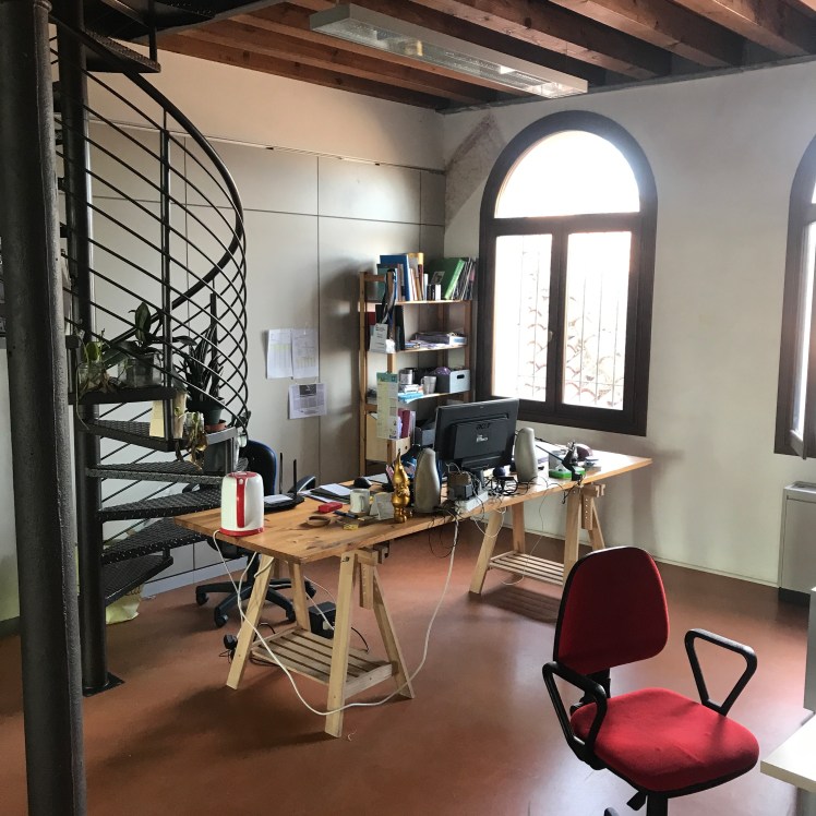 Traces of the building’s pre-industrial beauty remain on the interior walls, in the form of fragmented frescoes high above what was once the altar space. However, it is not the past that brings us to this church, but rather what is happening inside this ancient space at present. In typical Venetian fashion, within these ancient walls something thoroughly modern has been built. Behind what once was the altar in the space where the congregation would have been seated, you find yourself faced with a multi-story office space of steel and glass. As you head up the stairs and down the corridor you sense technology and innovation, work wholly dedicated to the future taking place within this historic space.