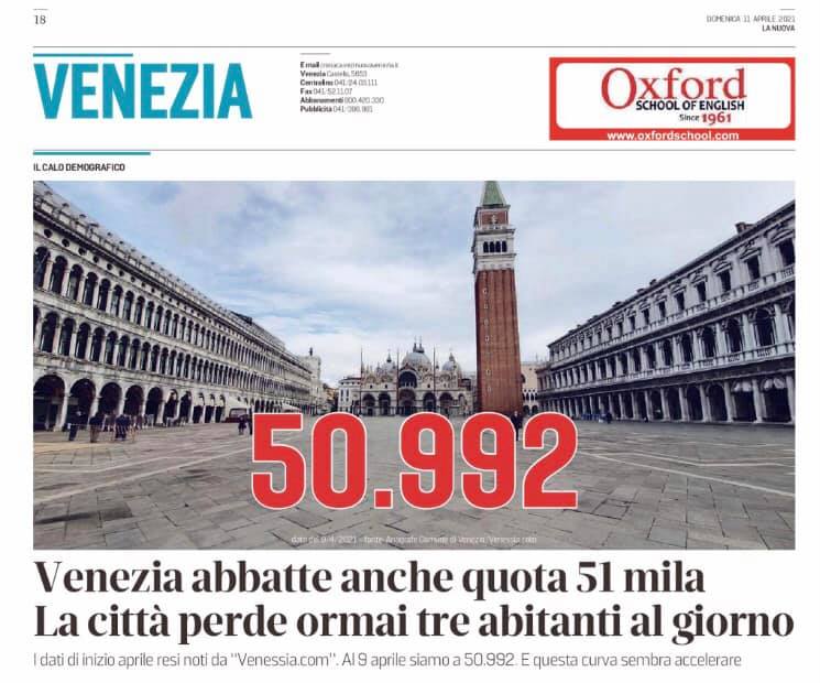 VENEZIA. The threshold of 51 thousand has been smashed. Venice continues, with a seemingly inexorable slope, to lose residents, and the statistical data commendably recorded on the association Venessia.com’s Facebook profile report that as of 9 April, the population has fallen to 50,992 in the historic city.