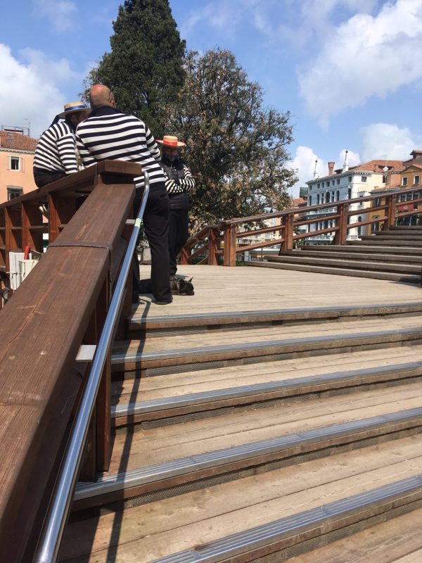 I continue my walk, and at the foot of the Accademia bridge I encounter three gondoliers in full dress, chatting; one of them has also brought along a beautiful French Boxer, who was peacefully taking the sun at its owner’s feet. Their gondolas are moored a few meters away, in the Canal Grande. The three know perfectly well that there won’t be any tourists to transport today; neither will there be serenades sung by improbable Romanian tenors, nor swearing at the vaporettos and boats causing waves. They are here, most likely, out of habit: to represent with their stripes a city that felt, until a few months ago, a sort of love and hate for tourists, who are simultaneously considered sacred and to be scammed.