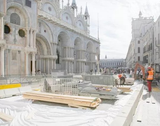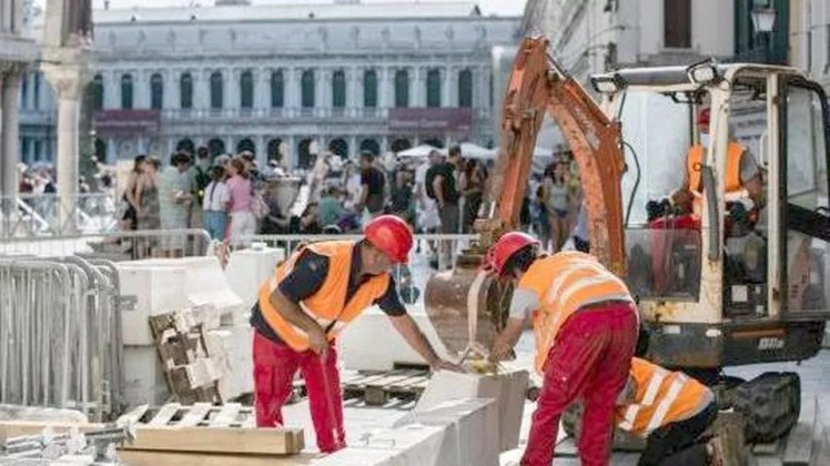 The paving stones (masegni) will be removed in order to inspect the underlying soil in front of the Basilica. Work is projected to last four months, with delays by acqua alte an unknown. The first work site has opened.