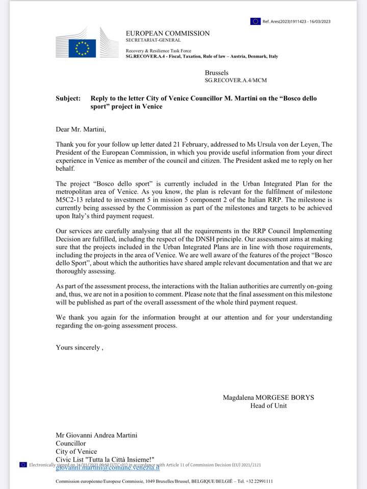 The EC is also examining observations such as those made by Italia Nostra Venezia, which has pointed out that the land where the arena and stadium are to be built is not a decaying urban area but rather an agricultural zone, and therefore not in line with the purposes of the National Plan and its requirements: that is, that no significant damage is caused to the environment.