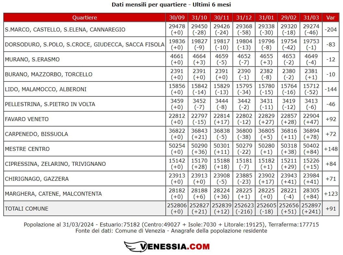 On the morning of April 2nd Venessia.com, the association that has been documenting the depopulation of the Venice Lagoon since 2000, published data regarding the change in the number of residents in the last six months, from September 2023 to March 31. The only real surprise was the slightly positive figure for the entire municipal territory: +91, thanks to a small boom on the mainland, +590 residents in six months, compared to an almost equivalent but slightly lower decline on the islands. Mestre Centro and Marghera are growing in particular, while Castello and Lido show pronounced decline. Thus in the selected time frame it is a series of plus signs for mainland areas, but a series of minus signs for areas in the lagoon.