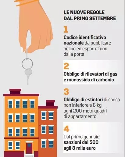 A national identification code to be published online and displayed outside the door of the property. Inside the apartment, mandatory gas and carbon monoxide detectors and fire extinguishers with a load of not less than six kilograms for every 200 square meters of surface.